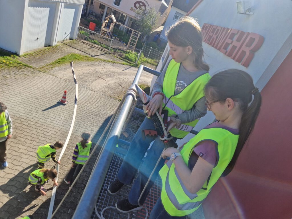 Neben dem Üben der Knoten gab es auch praktische Aktionen: So wurde ein Schlauch mit Strahlrohr hochgezogen, ein Tauziehen durchgeführt und gemeinsam das LF gezogen. Diese Übungen sorgten für viel Spaß und stärkten gleichzeitig den Teamgeist.