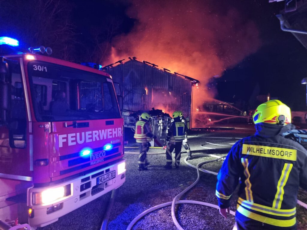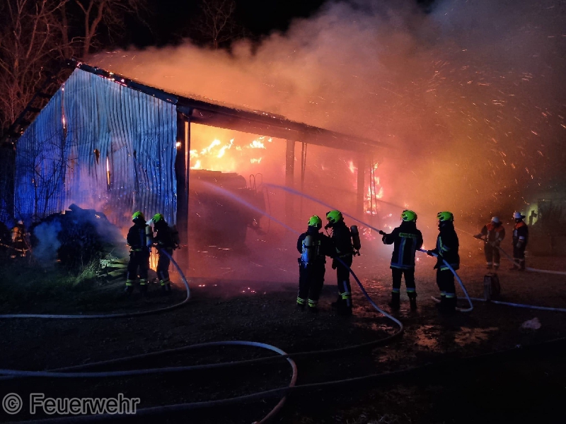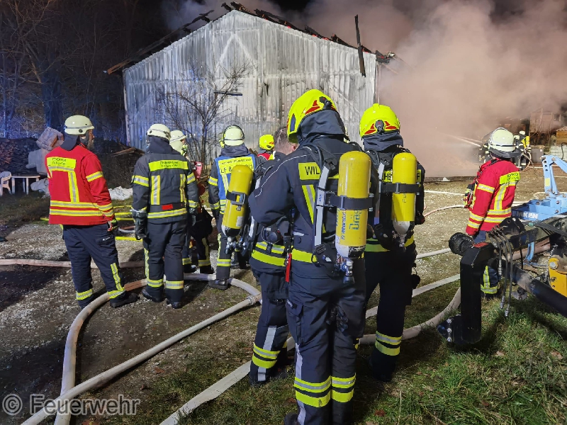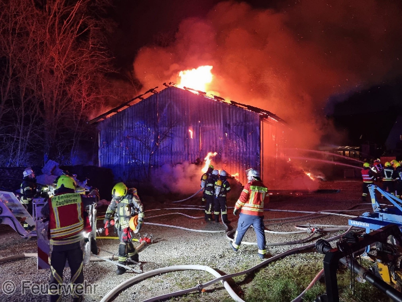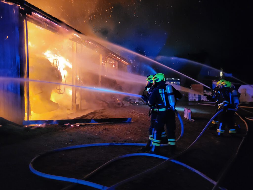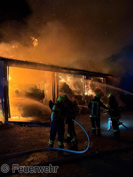 Mitten in der Nacht vom ersten auf den zweiten Januar 2025 wurden wir um kurz nach 3 Uhr gemeinsam mit zahlreichen umliegenden Wehren zu einer brennenden Scheune nach Eckenberg alarmiert. Bereits auf der Anfahrt war von weitem der Feuerschein am Himmel sichtbar, sodass sich die Meldung von einem Vollbrand schnell bestätigte. Gemeinsam mit den Kameradinnen und Kameraden der anderen Wehren starteten die Besatzungen unsere beiden Löschfahrzeuge umgehend einen massiven Löschangriff, sodass sehr schnell das Feuer eingedämmt und ein Übergreifen der Flammen auf umliegende Gebäude verhindert werden konnte. Da sich abzeichnete, dass eine größere Menge Löschwasser benötigt werden würde, verlegte unser Sonderlöschfahrzeug parallel eine lange Schlauchleitung von einem Löschwasserbehälter in der Ortsmitte zum Einsatzort. Den weiteren Einsatzverlauf sollten mehrere hundert in der Scheune lagernde Strohballen maßgeblich bestimmen. Da diese erfahrungsgemäß im gelagerten Zustand nicht abgelöscht werden können, organisierten Landwirte mehrere Traktoren, Radlader, sowie einen Mobilbagger. Mit deren Hilfe wurde die große Menge Stroh nach und nach aus der Halle gebracht und auf einem angrenzenden Acker verteilt. Da das Stroh während dieser zeitintensiven Arbeiten immer wieder aufflammte, wurden durch uns über mehrere Stunden zahlreiche Trupps unter schwerem Atemschutz gestellt, welche aufkommende Flammen direkt wieder bekämpften. Hier machte sich der Betrieb unserer eigenen Atemschutzwerkstatt bezahlt, wodurch bereits während des laufenden Einsatzes weitere Atemschutzgeräte und Ersatzflaschen nachgeführt werden konnten. So wurden während des Einsatzes alleine durch uns rund 25 Pressluftflaschen mit Atemluft geleert und anschließend direkt im Feuerwehrhaus wieder gefüllt. Als sich rund 6 Stunden nach der Alarmierung die Lage nach und nach entspannte, übernahmen die örtlich zuständigen Kameradinnen und Kameraden aus Eckenberg/Borbath bzw. Emskirchen und wir konnten die Rückfahrt zum Feuerwehrhaus antreten. Hier galt es dann die Einsatzbereitschaft wiederherzustellen, wofür aufgrund der enormen Materialmenge auch noch mehrere Stunden Arbeit notwendig waren.