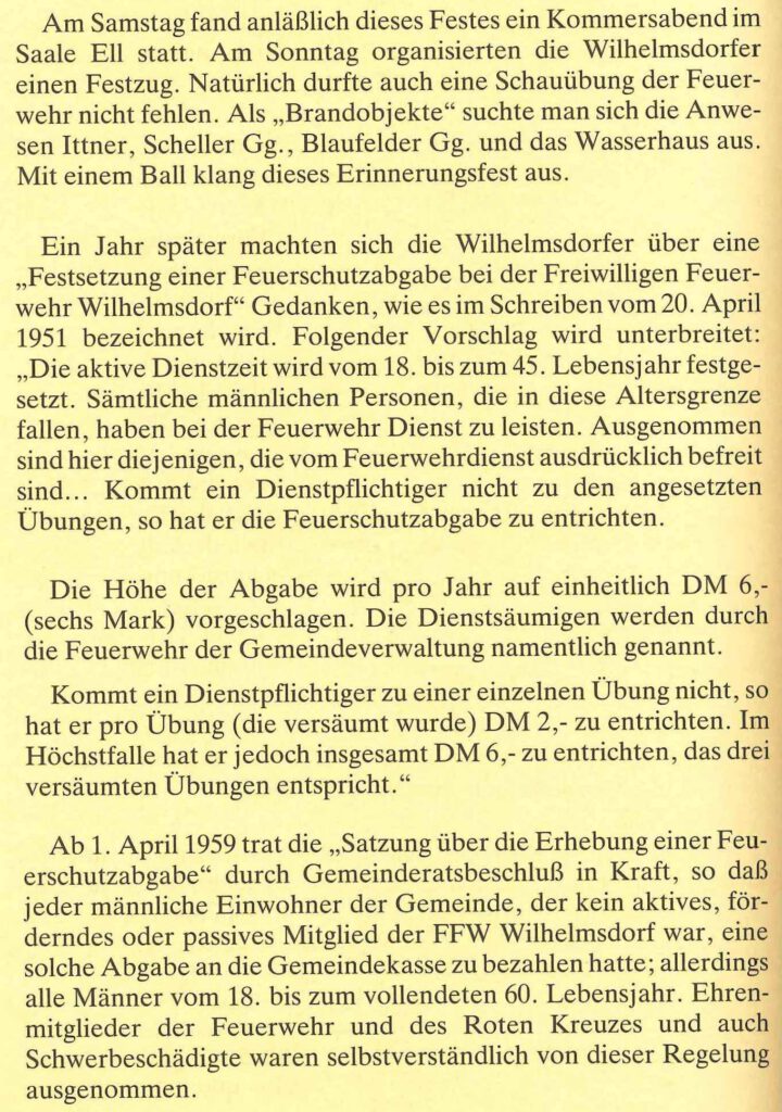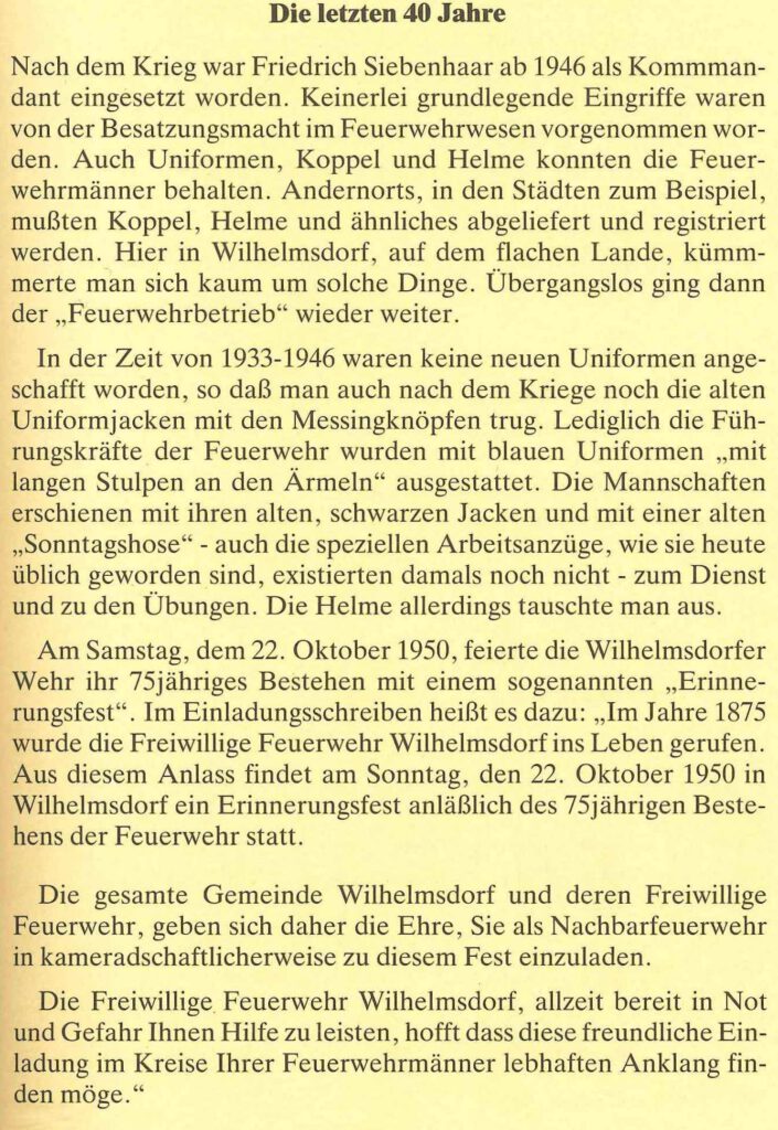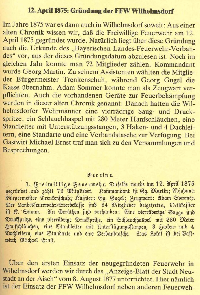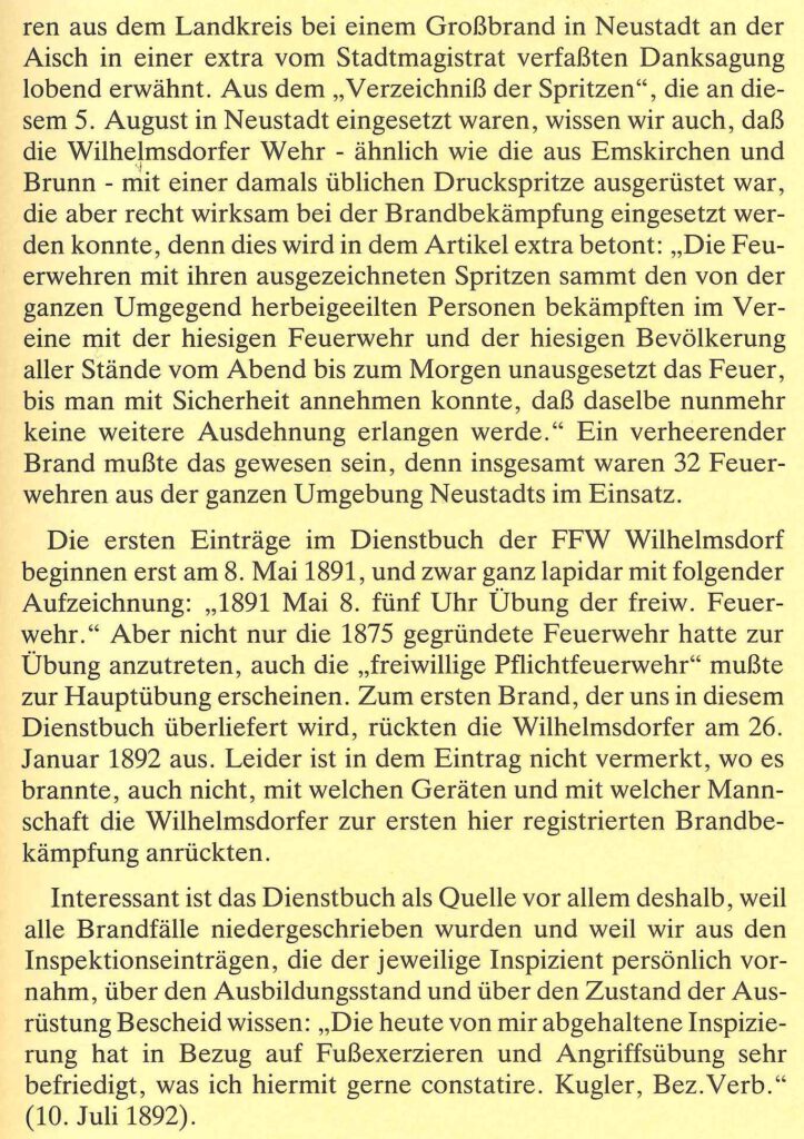 Am 19. und 20.5.1999 wurde das 100 jährige Feuerwehrjubiläum der Feuerwehr Ebersbach-Oberalbach begangen. Dabei wurde zusammen mit Bürgermeister Willi Seibold eine neue Tragkraftspritze übergeben. An der Jahreshauptversammlung am 14.1.2000 übernahm Matthias Probst den erstmals vergebenen Posten des stellvertretenden Vorsitzenden. Am 14.4.2000 fand der Festakt zum 125. Jubiläum der Feuerwehr Wilhelmsdorf in den Brennereistuben statt. Der Männerchor des Singvereins 1843 Wilhelmsdorf und der Chor Ad libitum sorgten für den passenden musikalischen Rahmen des Festes. Im Mai wurden zwei Musikveranstaltungen auf dem Parkplatz der Firma Jacob gefeiert. 2002 wurde die Jugendgruppe neu gegründet. Dafür entwickelten Reiner Gogol und Matthias Probst mit großem Engagement ein Konzept. Mitglieder durften Jugendliche im Alter von 12 Jahren werden; ab 16 Jahren durften sie an Einsätzen mitwirken. Des Weiteren wurde ein PKW-Anhänger für sämtliche Nutzfahrten angeschafft. Außerdem wurde ein Atemschutzluftkompressor gekauft. Im Mai 2003 konnte die Feuerwehr ein Bockbierfest im Gerätehaus abhalten. 2004 kam es zu einem Wechsel in der Führung der Vorstandschaft. Frank Friedrich übernahm dabei das Amt des stellvertretenden Vorsitzenden, nachdem Matthias Probst aus beruflichen Gründen zurückgetreten war. Am 2.10.2005 fand die Einweihung und Neueröffnung der Wilhelmsdorfer Fußverbindungen statt. Die anschließende Verpflegung wurde durch die Feuerwehr organisiert. An diesem Abend fand noch ein Grillfest mit musikalischer Umrahmung durch das Aurach Duo statt. Zu einem großen Einsatz in der Ortsmitte wurde die Feuerwehr an einem Samstagmorgen im Juli 2006 gerufen. Während sich eine Abordnung der Feuerwehr auf dem Kreisjugendfeuerwehrtag in Langenfeld befand, ereignete sich ein Brand im Kniestock eines Einfamilienhauses. Durch das schnelle Eintreffen und der gute Zusammenarbeit der Feuerwehr konnte das Feuer schnell unter Kontrolle gebracht werden. Im Dezember 2006 feierte die Gemeinde das 100-jährige Jubiläum des ehemaligen Schulhauses. Die Feuerwehr erklärte sich bereit, an diesem Tag die Bewirtung zu übernehmen. Dabei wurden Kaffee und Kuchen sowie Glühwein und Bratwürste angeboten. Das Jahr 2007 begann mit einer großen Veränderung in der Führung. Matthias Probst wurde zum 1. Kommandanten und Tobias Redlingshöfer zum 2. Kommandanten gewählt. Frank Friedrich übernimmt das Amt des Vorsitzenden. Sein Stellvertreter wurde Stefan Färber. Kassenwart wurde Thomas Schneider und Schriftführer André Wohlleb. Für uns alle unfassbar, mussten wir im Februar desselben Jahres von unserem guten Freund und Kameraden Frank Schneider Abschied nehmen. Die Einweihung des neuen Feuerwehrhauses und die Fahrzeugweihe des neuen TSF der Feuerwehr Ebersbach-Oberalbach wurden am 26.9.2007 gefeiert. Dabei wurden am Nachmittag der Bevölkerung zahlreiche Schauübungen präsentiert. Abends sorgte die Band „Firestone und Balu“ für gute Unterhaltung. Die Bewirtung übernahm an diesem Tag die Familie Günthner. 2008 unterstütze die Jugendfeuerwehr den Obst- und Gartenbauverein bei der Durchführung des Rotdornfestes am Hugenottenplatz vor der Sparkasse. Am September 2008 fand der erste Berufsfeuerwehrtag für die Jugendfeuerwehr statt. Dabei wird den Jugendlichen in 24 Stunden der Alltag einer Berufsfeuerwehr mit nachgestellten Einsätzen nähergebracht. Dieser findet ab 2009 alle zwei Jahre statt. Nach dem Rücktritt von Matthias Probst als Kommandant wurde Anfang 2009 Rüdiger Probst zu seinem Nachfolger gewählt. Am erstmals stattfindenden Weihnachtsmarkt beteiligte sich die Feuerwehr mit einer Bude. Bis heute gehört die Teilnahme am Wilhelmsdorfer Weihnachtsmarkt zu einem Höhepunkt in der Adventszeit. Aufgrund des starken Schneefalls entschied man sich im Januar 2010 kurzfristig dazu, erstmals ein Nachtrodeln abzuhalten. Die Resonanz bei den Menschen war sehr positiv. Zu Beginn der Sommerferien bekam die Jugendfeuerwehr eine Führung durch das Stadion in Nürnberg. Am 12.2.2011 wurde nach fast 10 Jahren wieder ein Faschingsball abgehalten. Dieser wurde von Jung und Alt gut angenommen. Im September 2011 besuchte uns eine Abordnung unserer Patenfeuerwehr aus Wilhelmsdorf am Bodensee. Unter anderem besichtigten wir dabei miteinander das Zirkelmuseum. 2012 gab es personelle Wechsel: Patrick Winkelhöfer wurde neuer 2. Kommandant. Er folgt dabei auf Tobias Redlingshöfer. Zudem wurde Tobias Gurt neuer Schriftführer. Am 22.4.2012 besichtigte die Jugendfeuerwehr die Flughafenfeuerwehr in Nürnberg. Höhepunkt in diesem Jahr war zweifellos die Einweihung des neuen Sonderlösch- und Hilfeleistungsfahrzeuges, welche am 13.7.2012 bei der Anwesenheit von Pfarrer Seidel, Bürgermeister Werner Friedrich und Mitgliedern des Gemeinderates stattfand. Nach einer Amtszeit von sechs Jahren trat Frank Friedrich bei der Wahl des Vorsitzenden am 1.2.2013 nicht mehr an. Ihm folgte Matthias Probst. Sein Stellvertreter blieb Stefan Färber. In diesem Jahr wurde von 12 Feuerwehranwärtern die Bayerische Jugendleistungsprüfung und von 7 Feuerwehranwärtern die Jugendflamme 1 abgenommen werde. Im Juli 2013 unternahm die Jugendfeuerwehr mit weiteren Mitgliedern der Wehr und deren Angehörigen einen Ausflug in einen Klettergarten und zur Rodelbahn mit Biergarten nach Pottenstein. Ab 2014 ist die Feuerwehr Wilhelmsdorf auf Facebook vertreten. Im Rahmen der Kreisorientierungsfahrt wurde die Patenwehr in Wilhelmsdorf am Bodensee besucht. Am 31.5.2014 wurde das Feuerwehrhaus in Oberalbach eingeweiht. Bei den Feierlichkeiten nahm eine große Abordnung der Wilhelmsdorfer Feuerwehr teil. Bei der Fußball-Weltmeisterschaft 2014 wurde im Feuerwehrhaus ein „Public Viewing“ veranstaltet. Somit wurde der Weltmeistertitel bei vollem Haus im Feuerwehrhaus bejubelt. Am Kreisjugendfeuerwehrtag nahm erstmals eine Jugendgruppe unserer Patenwehr teil. Dafür gab es einen Sonderpokal. Im Oktober 2014 fand eine Einsatzübung in einem lee